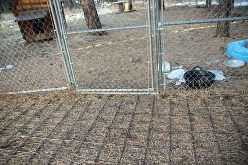 Some breeders recommend six foot high fencing concreted into the ground. I have been to some of these breeders homes and the dogs were in an area with four foot chain link fencing or had flimsy 4x4 horse fencing, four feet high, attached to steel stakes. What I have found is that many of these people will tell you things that they are not doing themselves. Why? I really don't know. Anyway, I believe that there are many ways to secure Tibetan Mastiffs and each depends on the dog and the situation it is in.